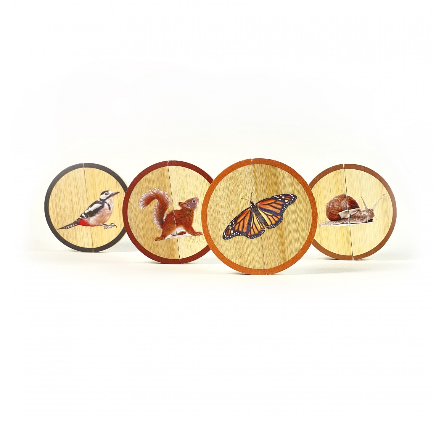Els Circles d’Animals del Bosc contenen quatre petits trencaclosques formats per dues peces magnètiques que mostren els següents animals: Ocell, Esquirol, Papallona i Cargol.