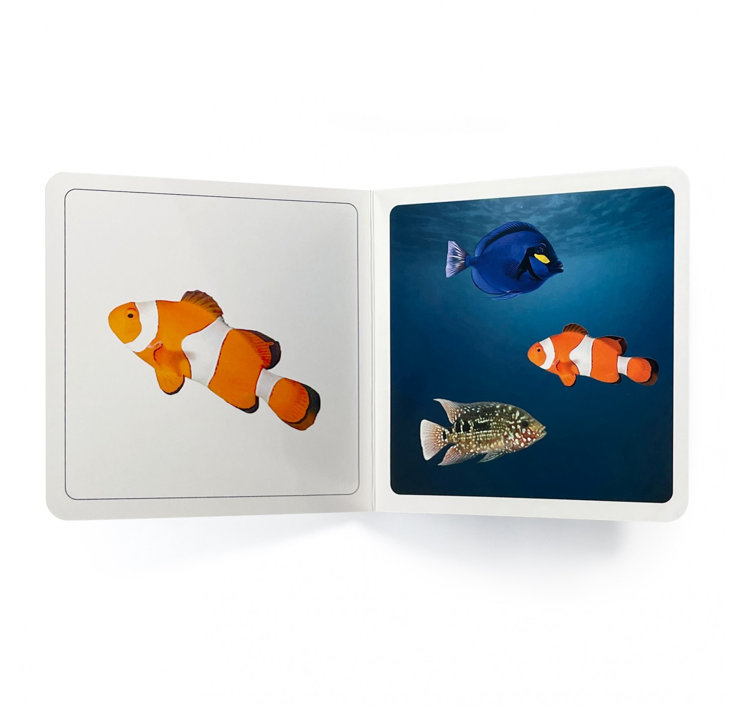 Llibre per a aprendre jugant a distingir colors i formes. Cal trobar el peix que apareix sol a l’esquerra entre els tres que es mostren a la dreta, tots amb formes i colors diferents.