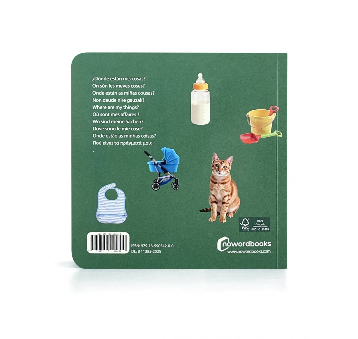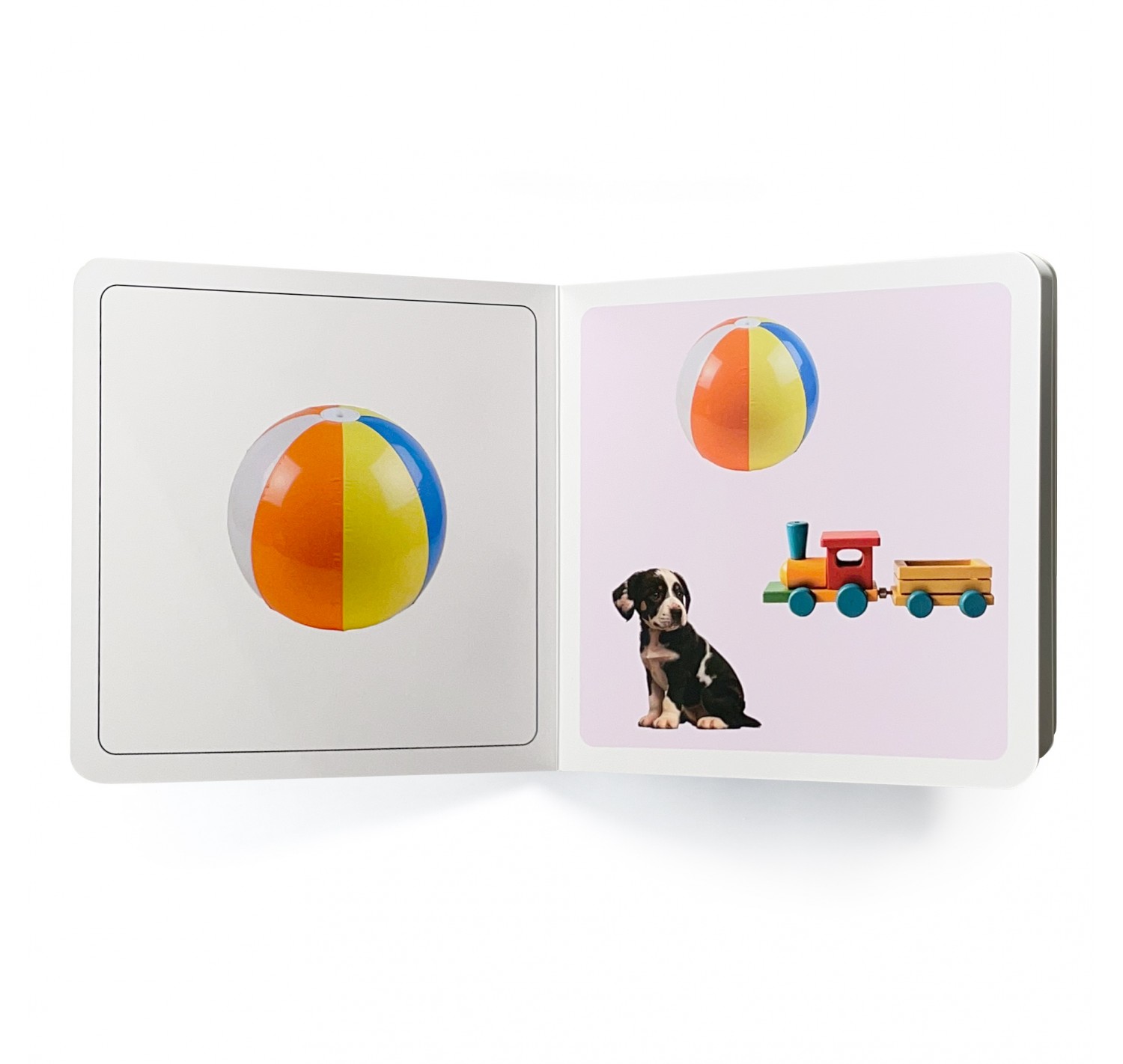 Llibre on les criatures han de cercar i reconèixer objectes quotidians. A cada pàgina doble, la imatge d’un objecte apareix sola a l’esquerra, mentre que a la dreta es mostren fotografies de tres objectes entre els quals cal trobar el que es repeteix.