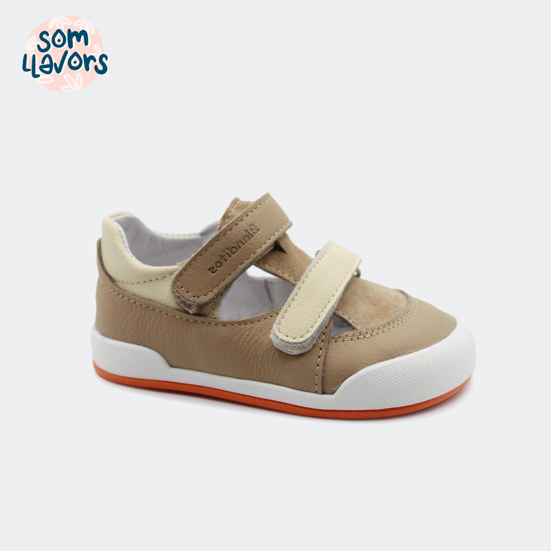Sandalias cerradas ideales para verano y entretiempo, con unos calcetines, de la marca Blanditos, en color arena y caramelo.