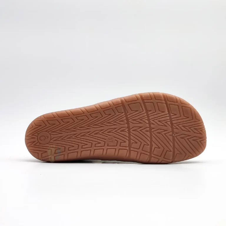 La seva sola de goma de 4 mm, plana i molt flexible, acompanya el moviment del peu sense interferir a la petjada. La puntera anatòmica respecta la forma natural dels dits i l’absència total de contraforts deixa al taló moure’s lliure, afavorint una sensació lleugera i fluida en caminar.