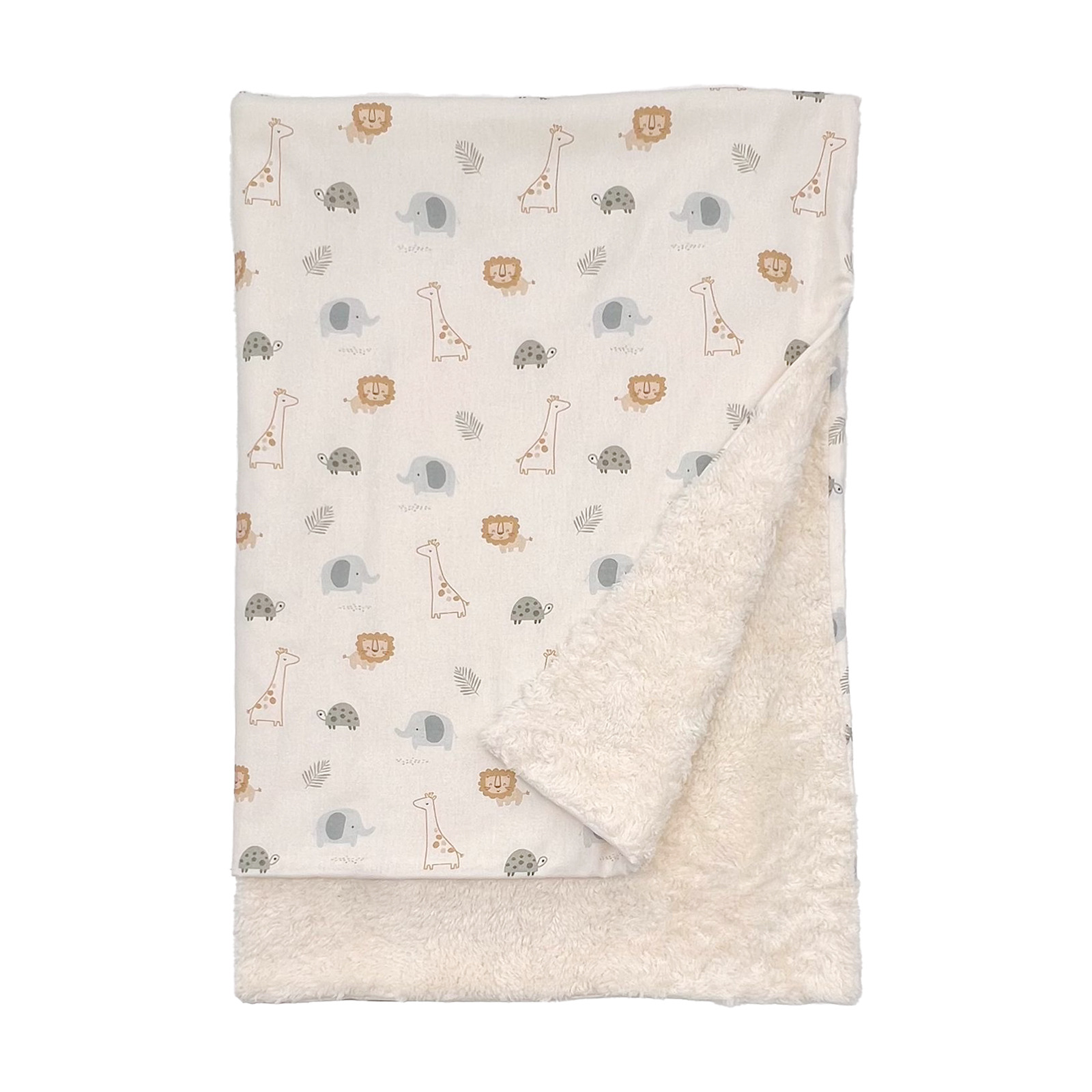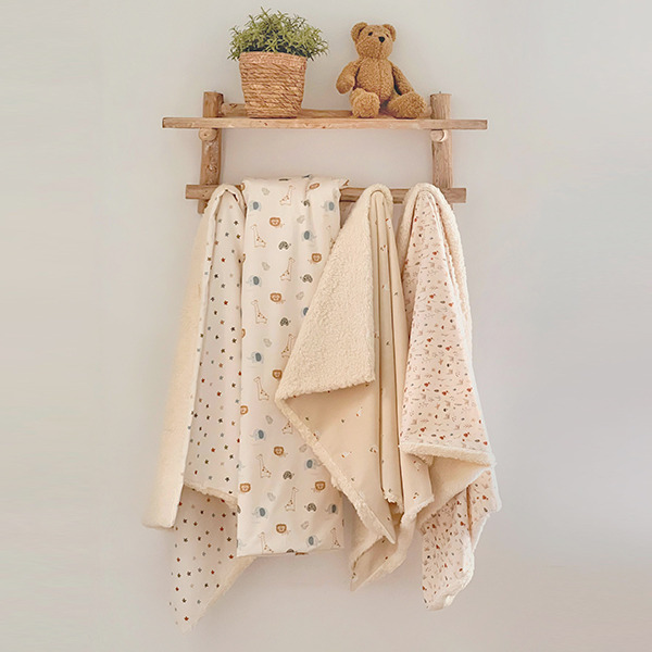 Manta reversible: d’una banda, estampat de falcó orgànic, i de l’altra, teixit polar suau i calentet. Ideal per al bressol, el cotxet i els moments de lactància.